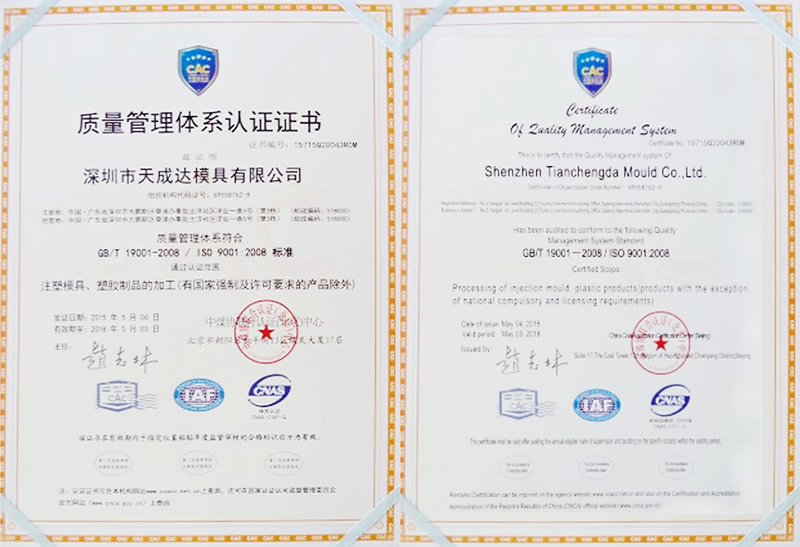 國際化、現(xiàn)代化經(jīng)營過程中天成達(dá)模具十分注重生產(chǎn)流程、質(zhì)量管理標(biāo)準(zhǔn)化和規(guī)范化的建設(shè)。為此,天成達(dá)長期秉持著“精密制造,為客戶提供有競爭力的產(chǎn)品;持續(xù)改進(jìn),為客戶提供優(yōu)質(zhì)滿意的服務(wù)”的質(zhì)量方針和宗旨。全員參與、全面品管,有效執(zhí)行ISO9001國際質(zhì)量體系標(biāo)準(zhǔn)。并對所有來料供應(yīng)商進(jìn)行嚴(yán)格的評估和考核,確保所有來料均符合工藝加工標(biāo)準(zhǔn)。